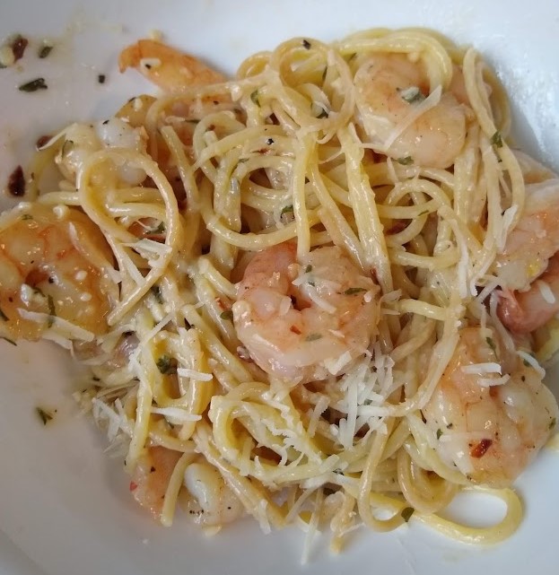 5. Drain pasta and add into the butter mixture, along with shrimp.